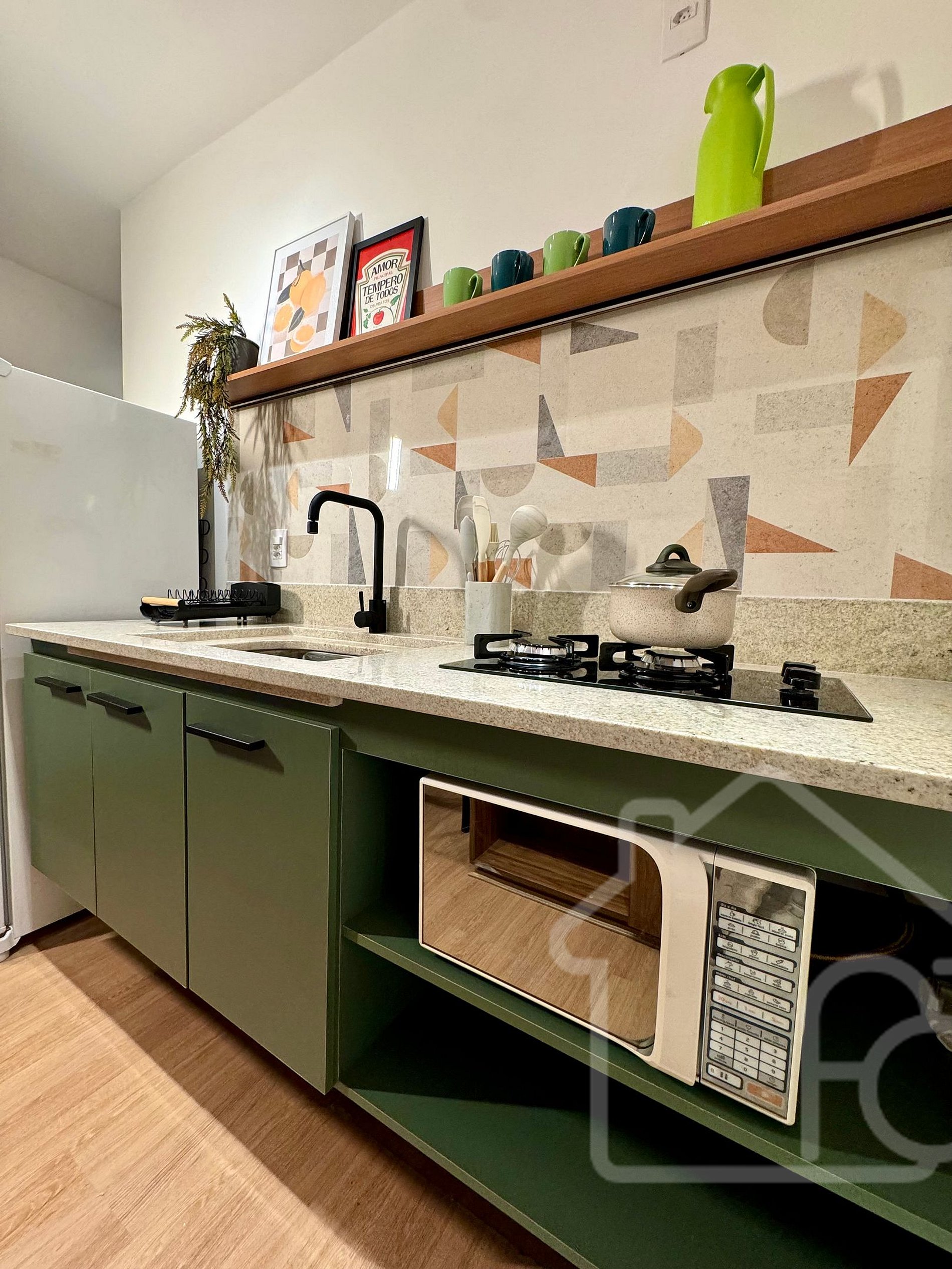 - Cozinha equipada com geladeira, freezer, micro-ondas, fogão cooktop, utensílios básicos para o dia a dia e espaço funcional para refeições