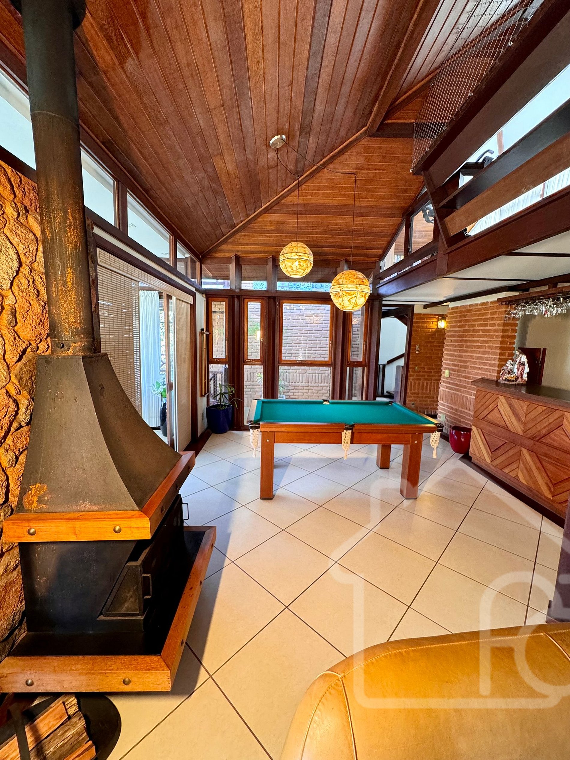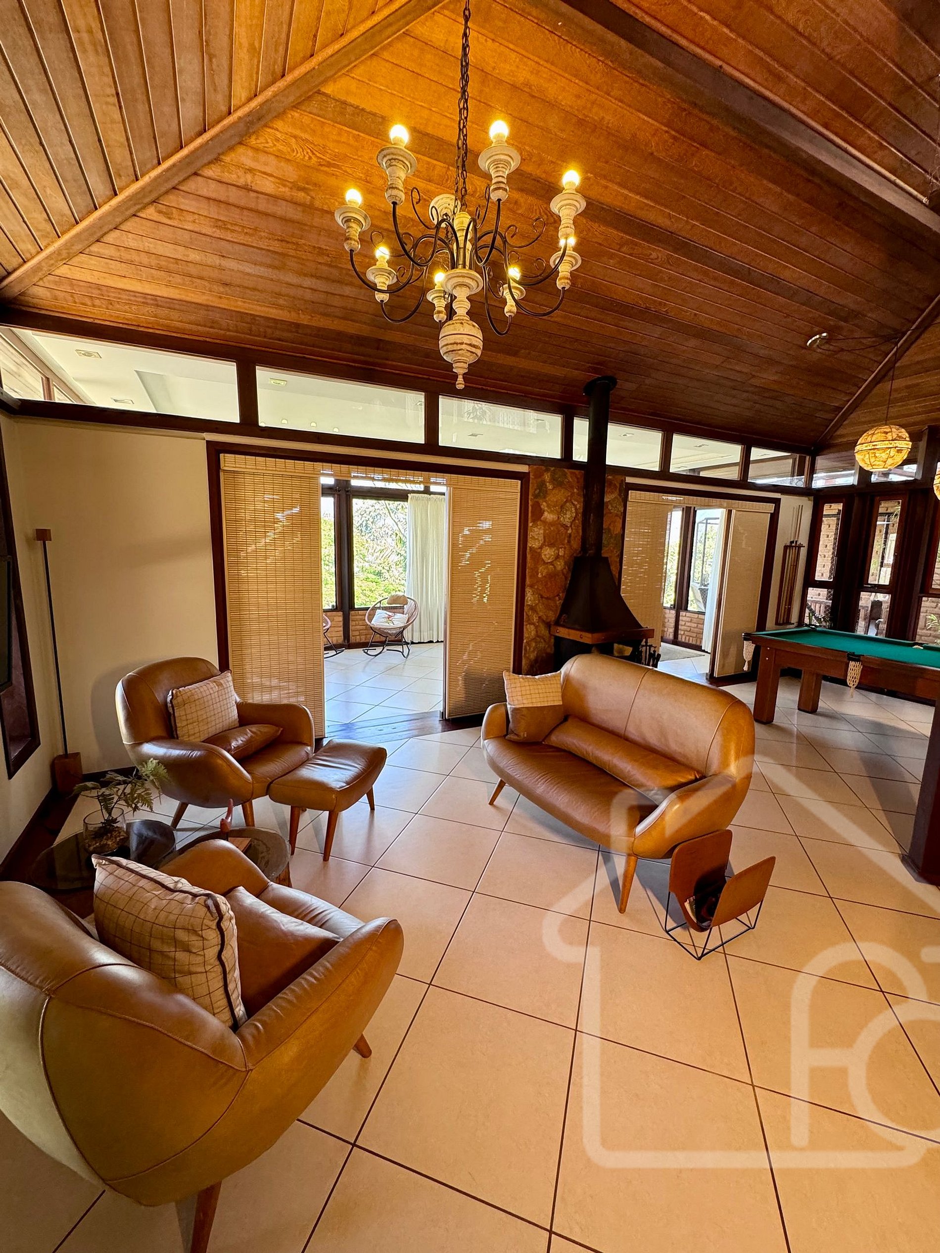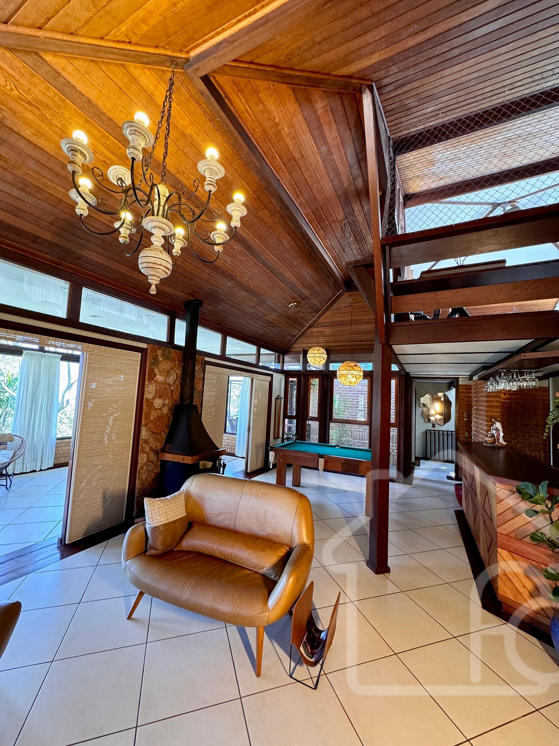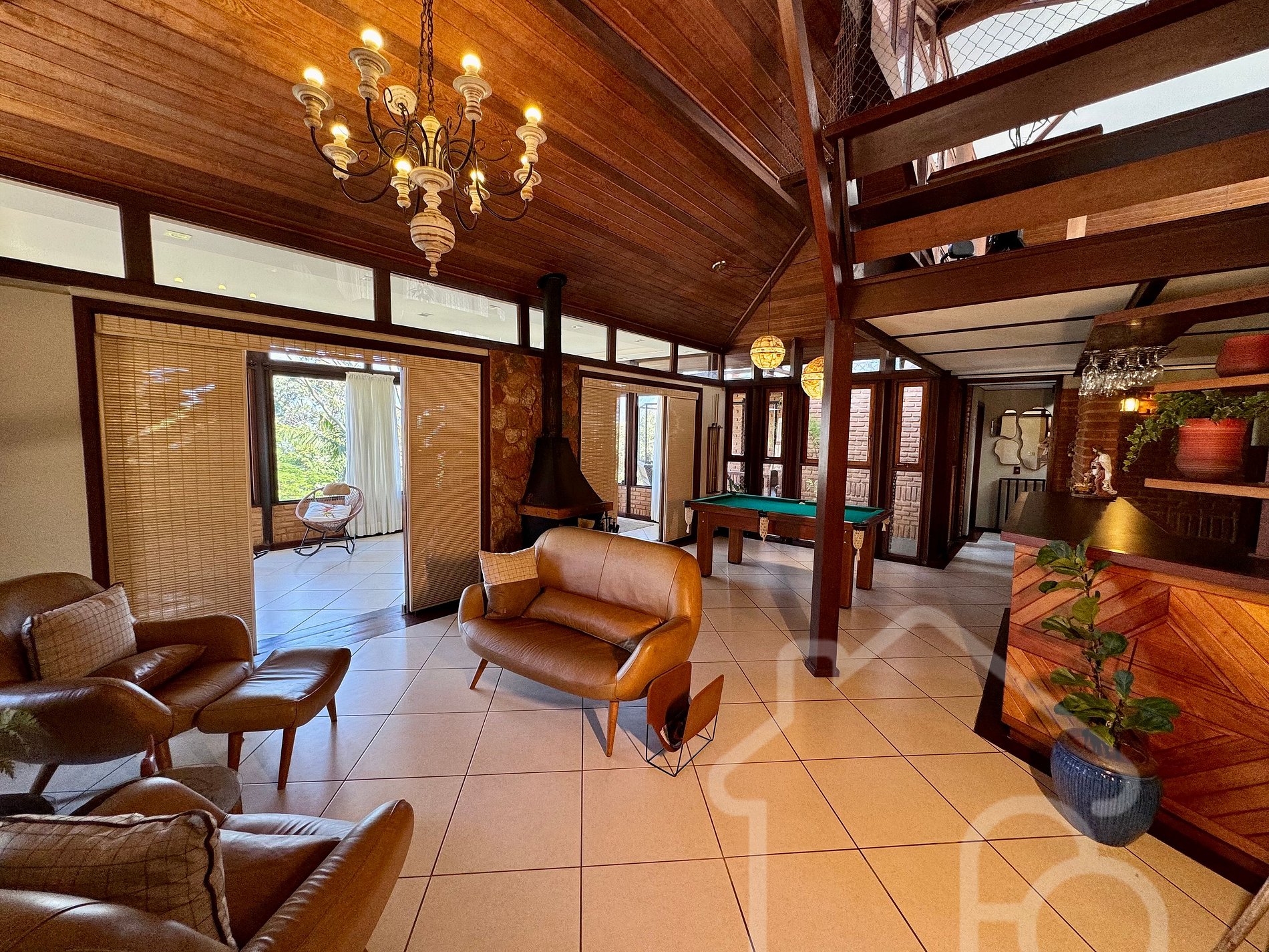 - Sala de estar principal com lareira, bar e mesa de sinuca