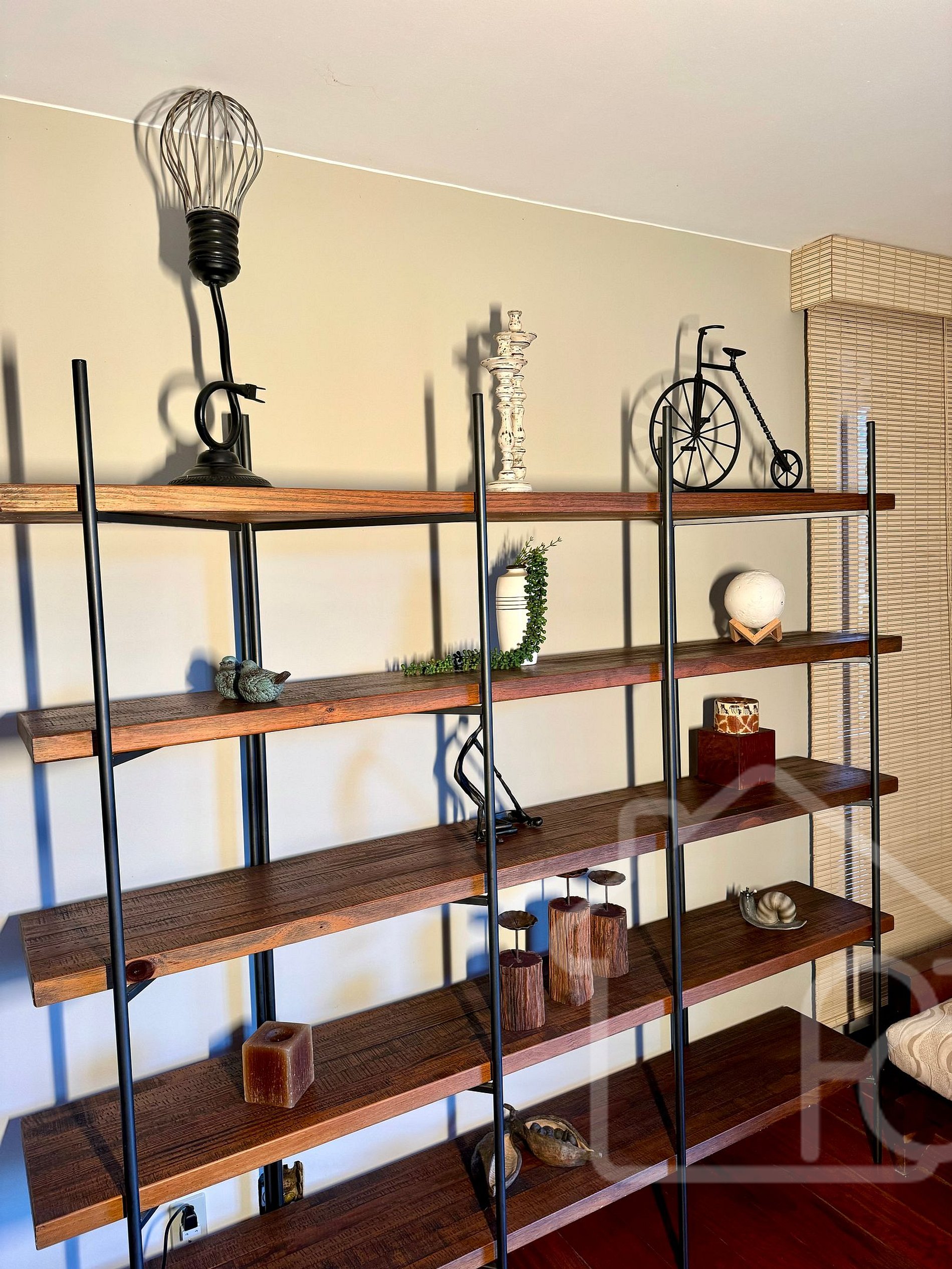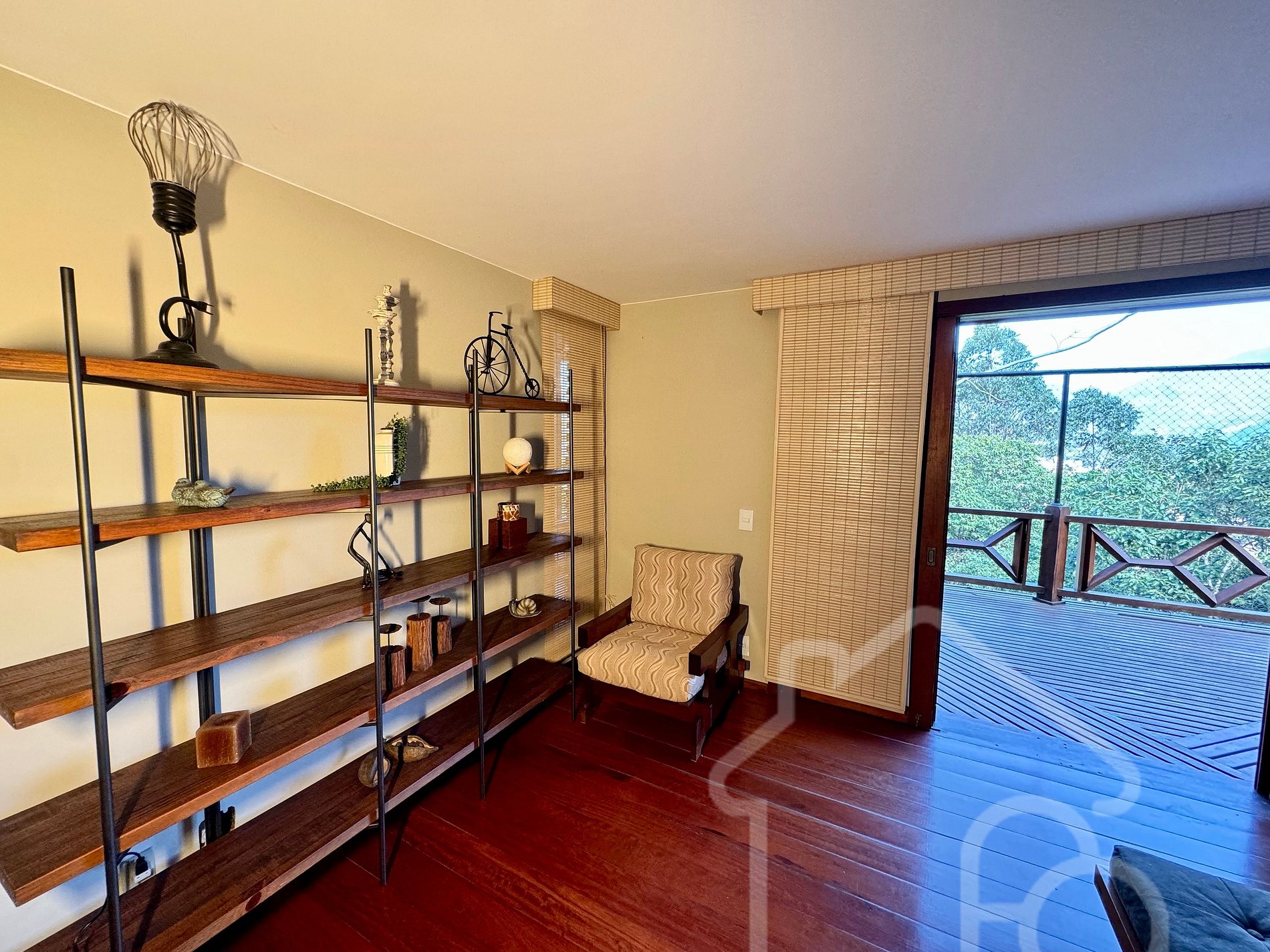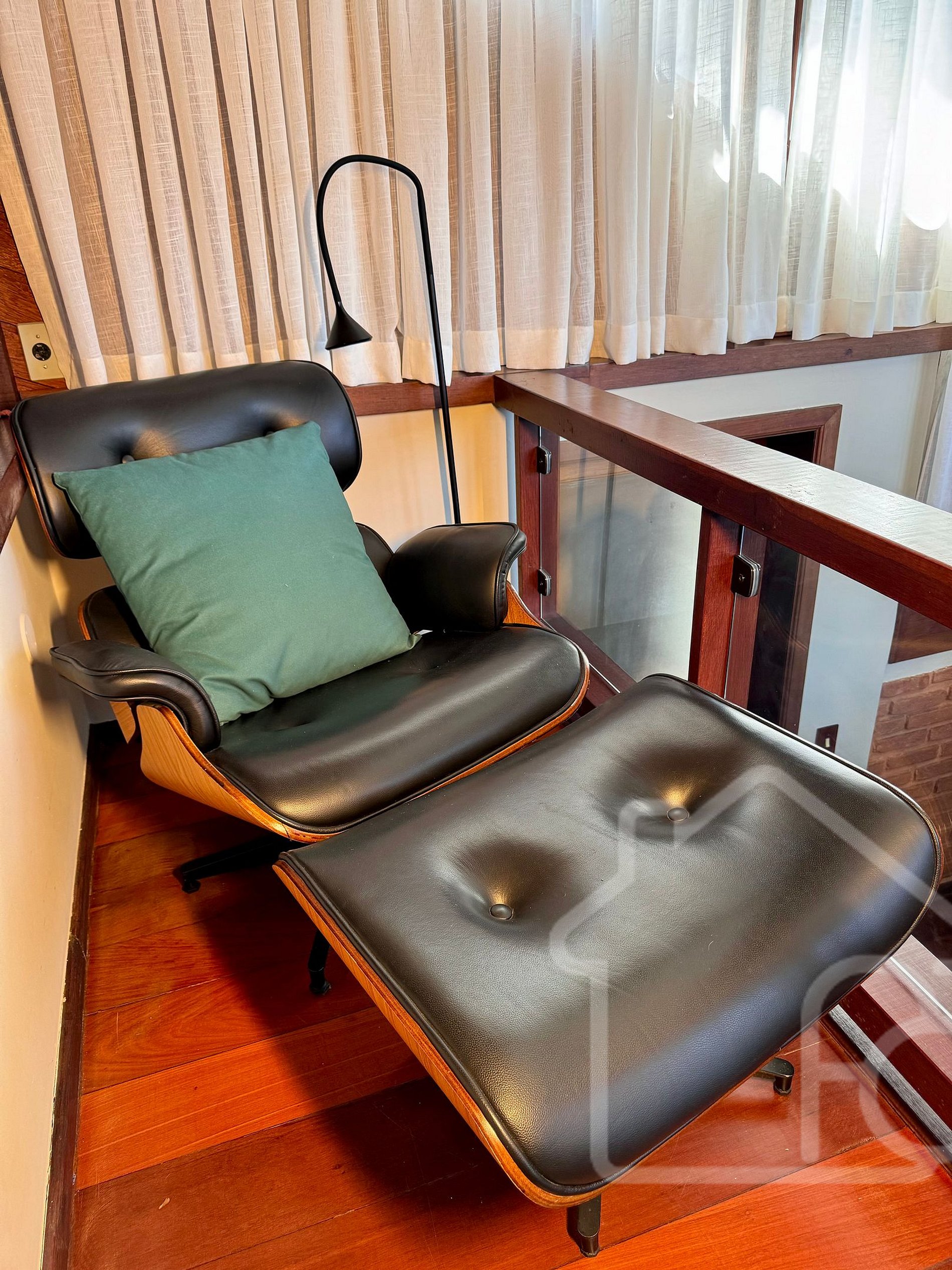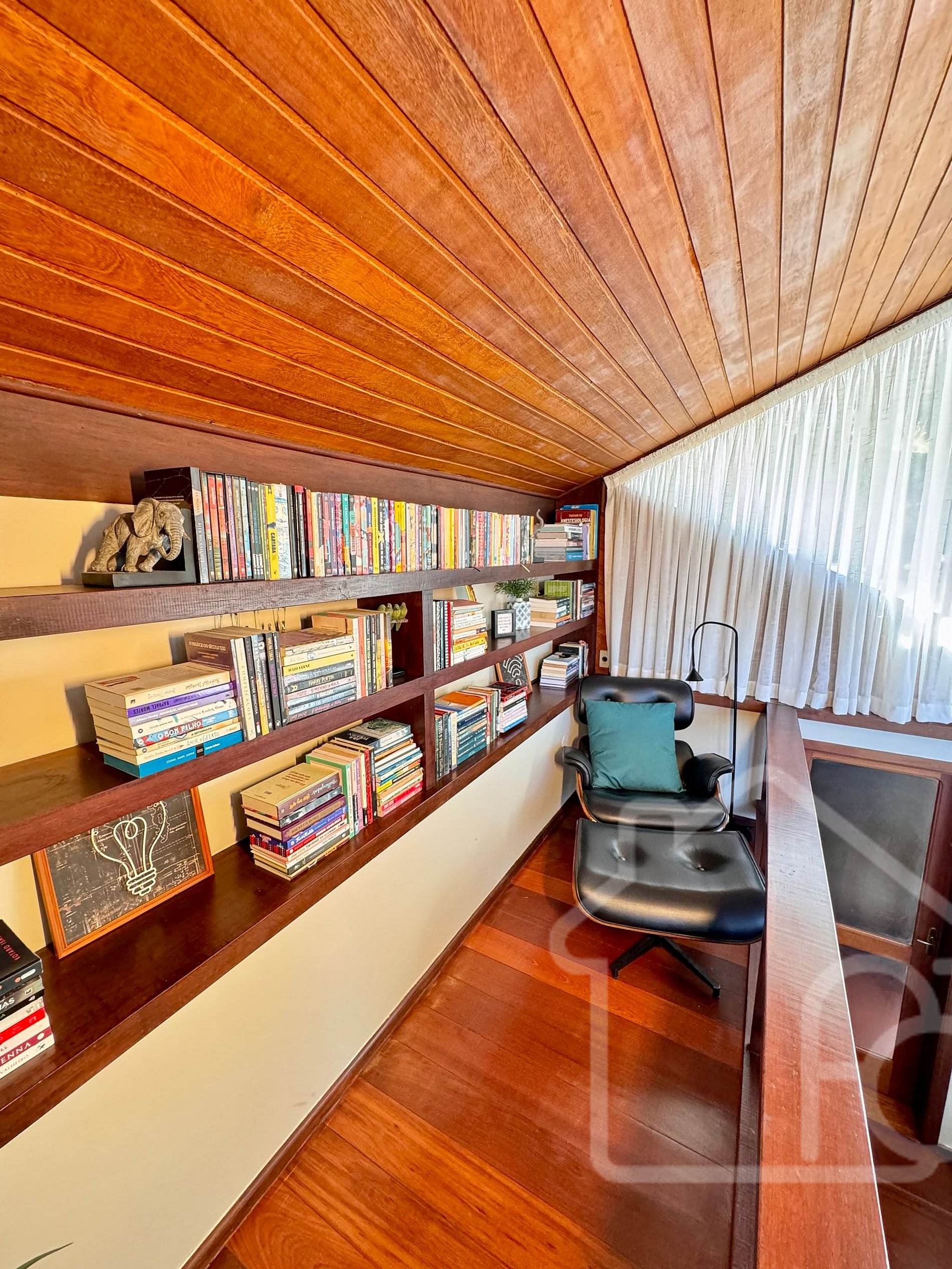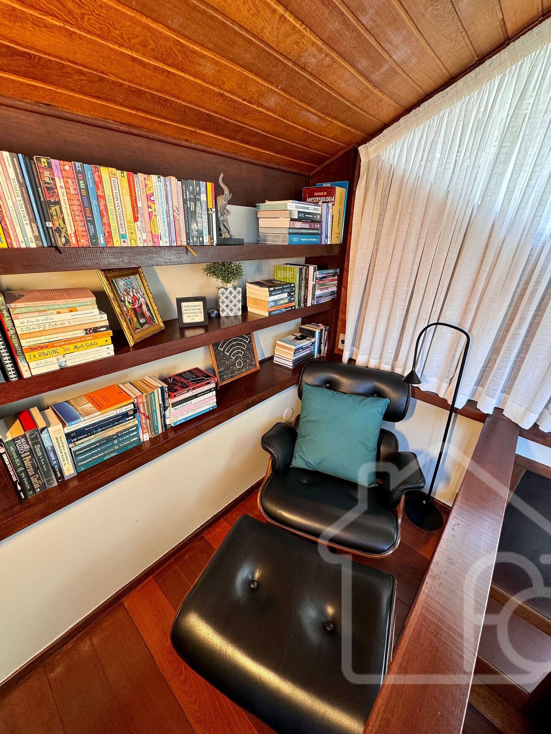 - Canto de leitura com biblioteca e poltrona Charles Eames