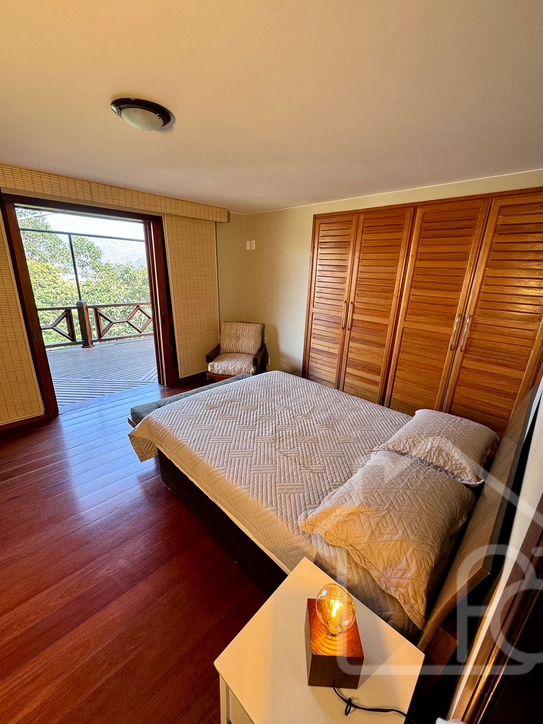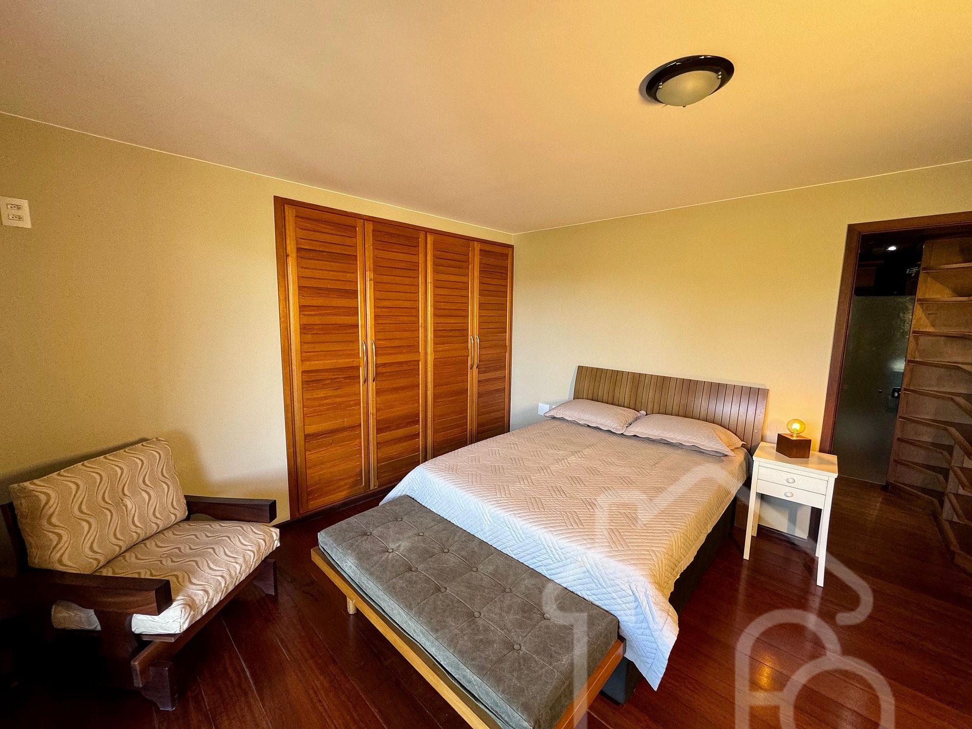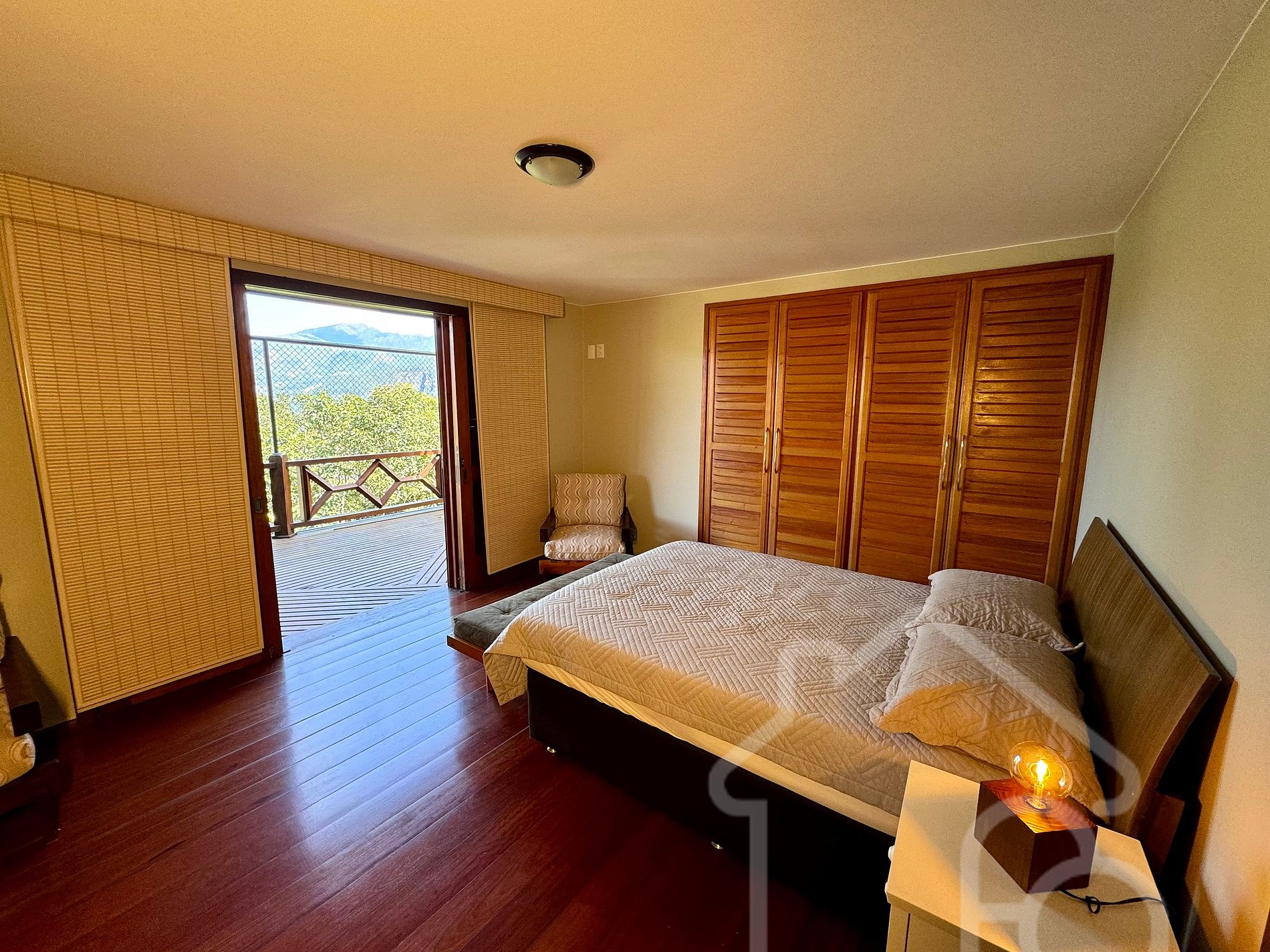 - Suíte com cama queen, armário, banheiro completo e varanda privativa