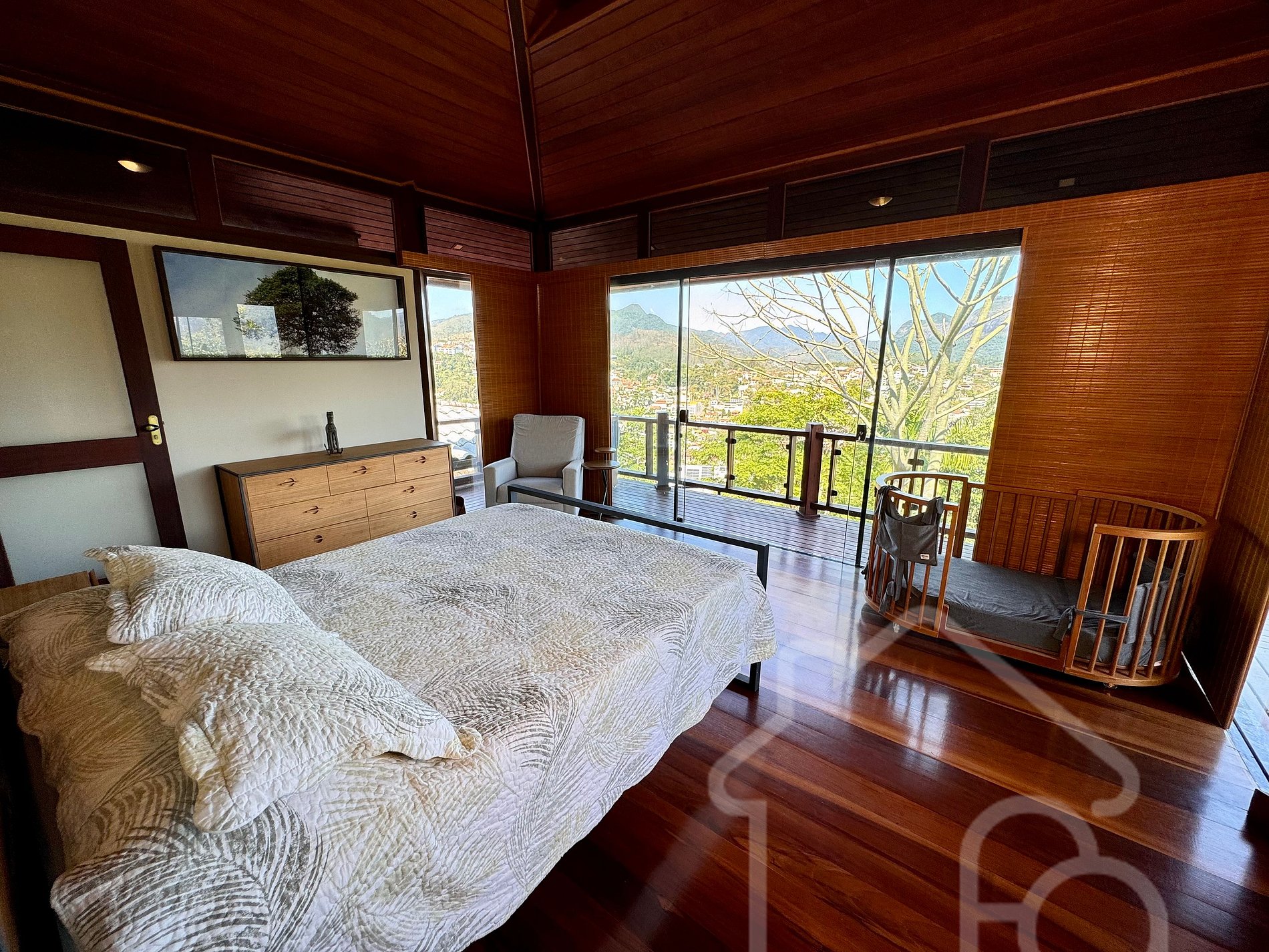 - Suíte principal com cama queen, berço portátil, poltrona e banheiro completo com secador de cabelo