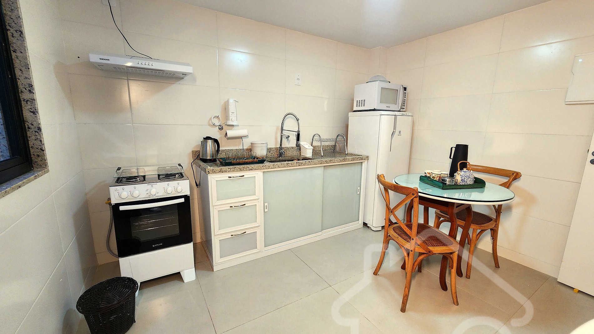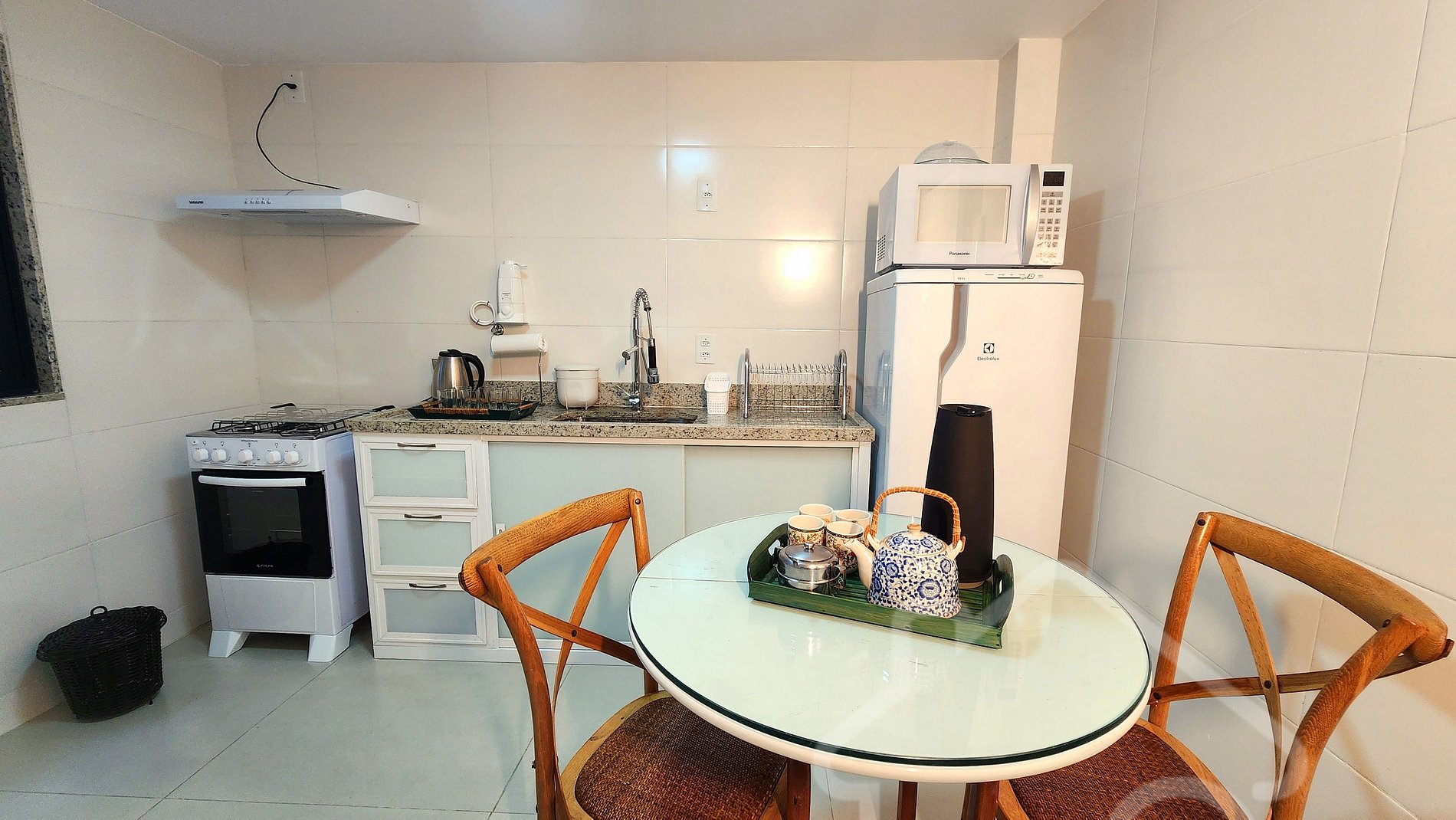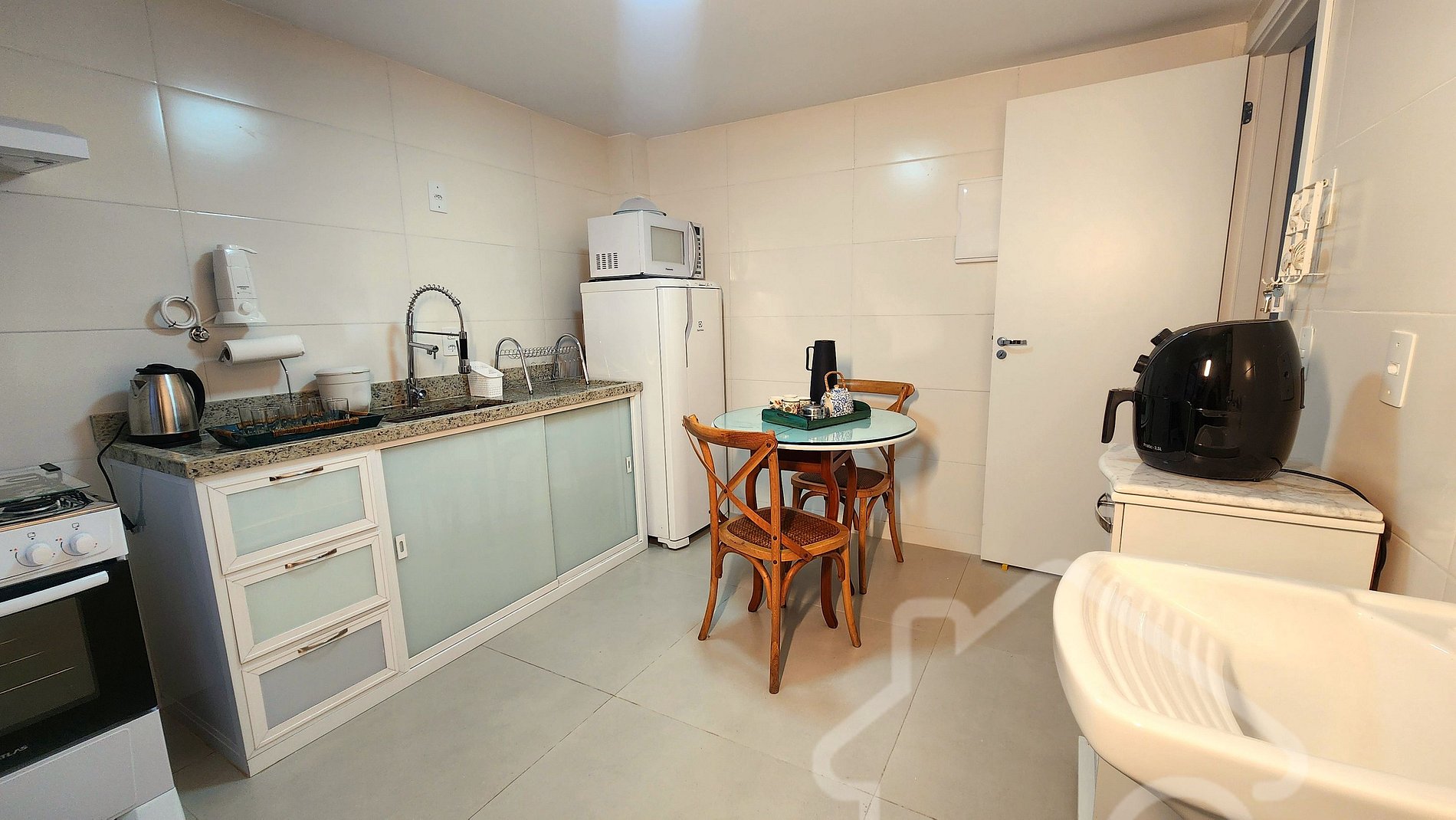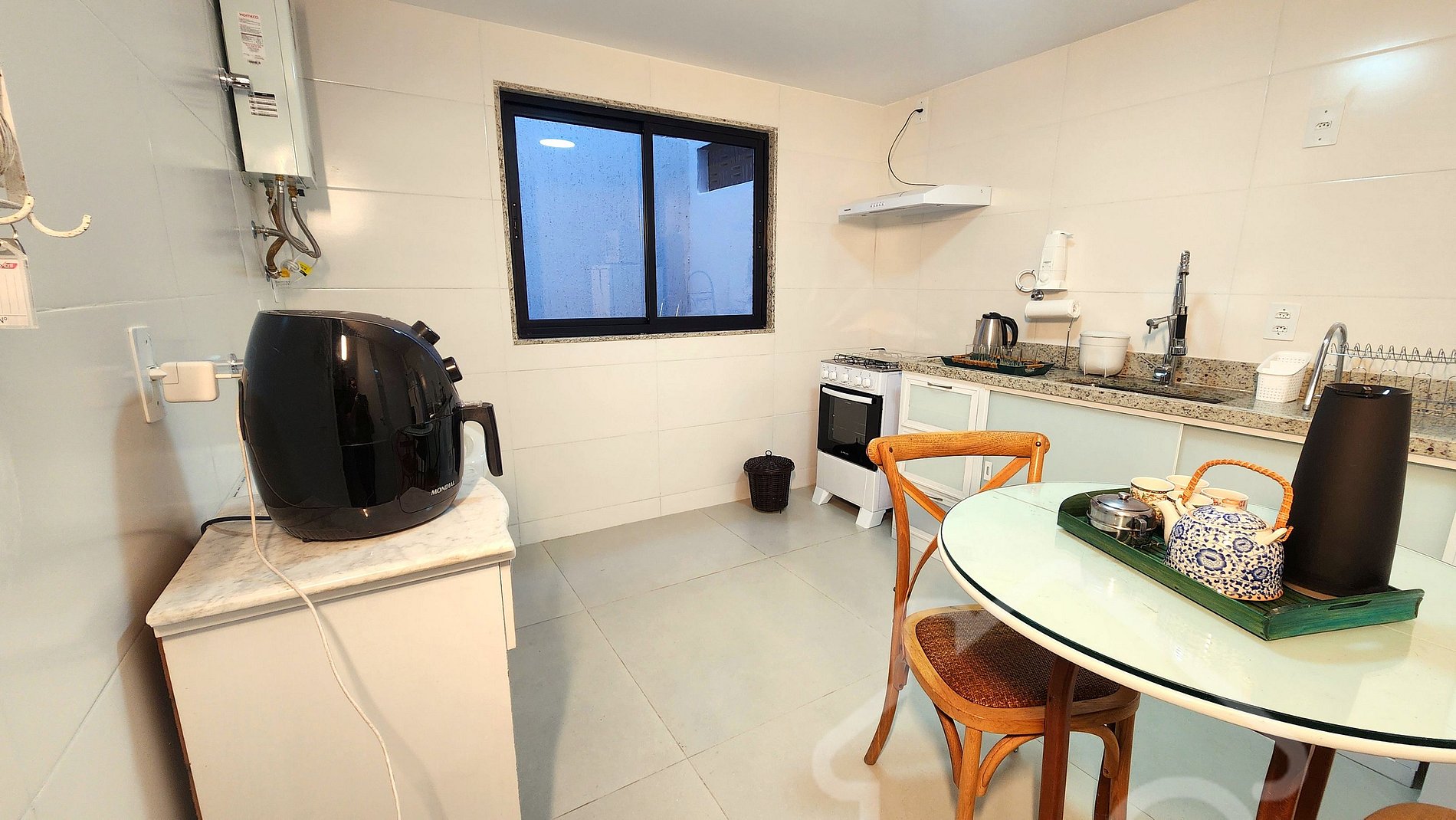 - Cozinha equipada: Fogão, geladeira, forno, micro-ondas, air fryer, chaleira elétrica, filtro de água e utensílios básicos.
