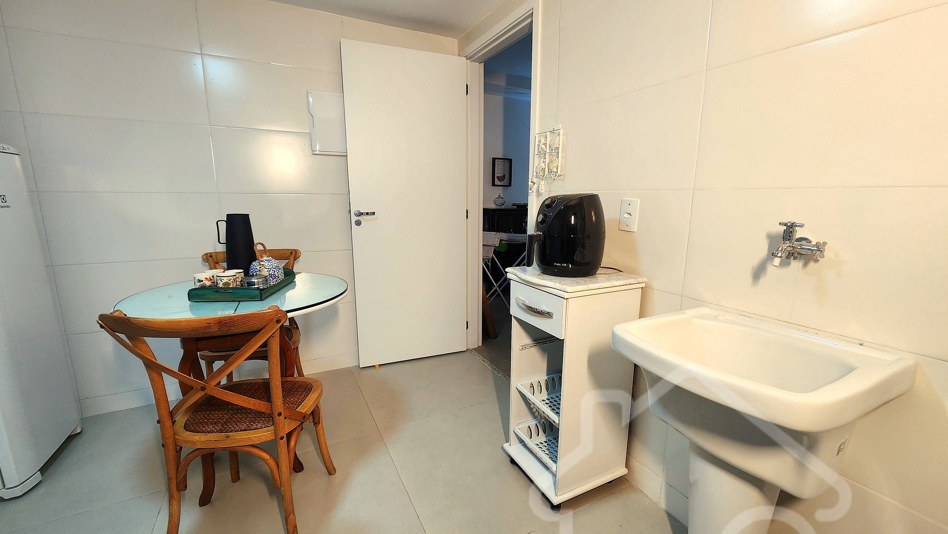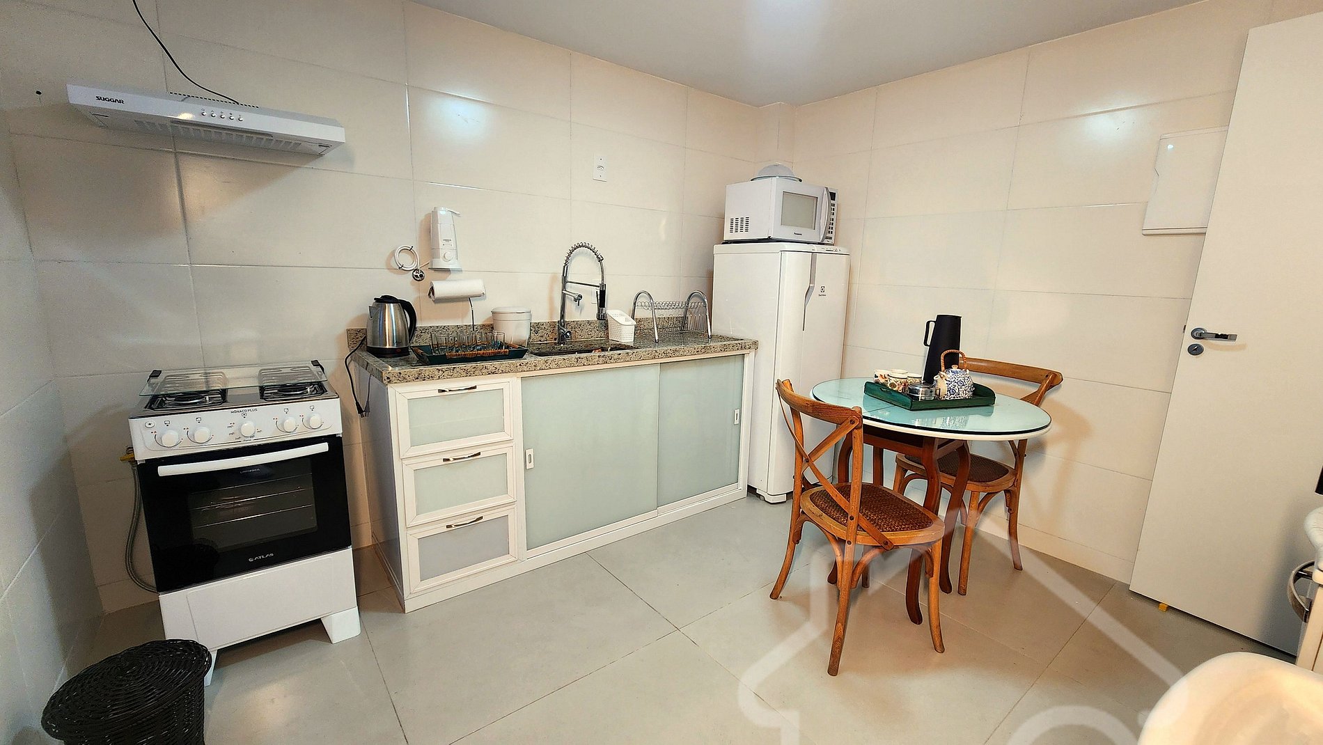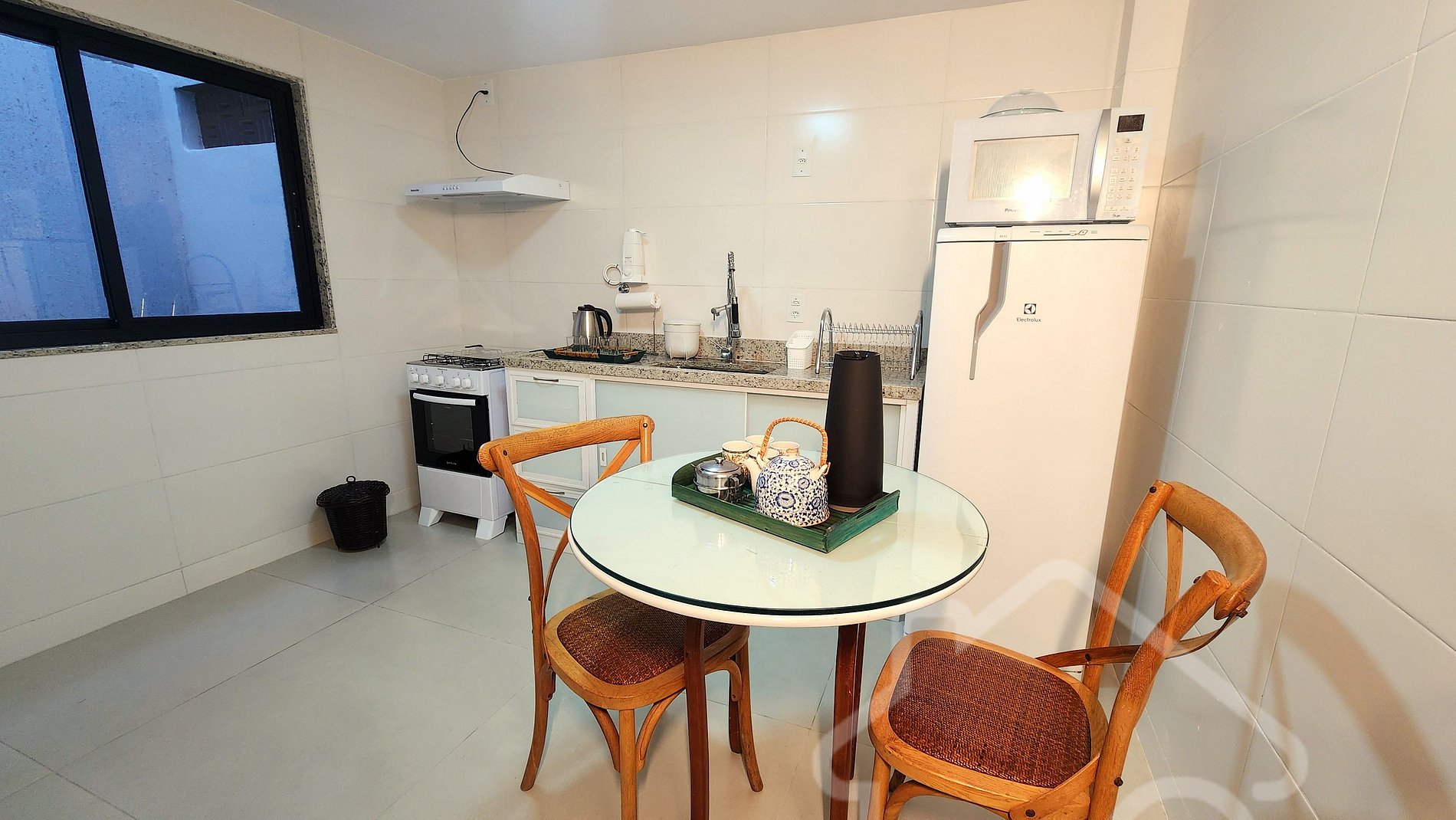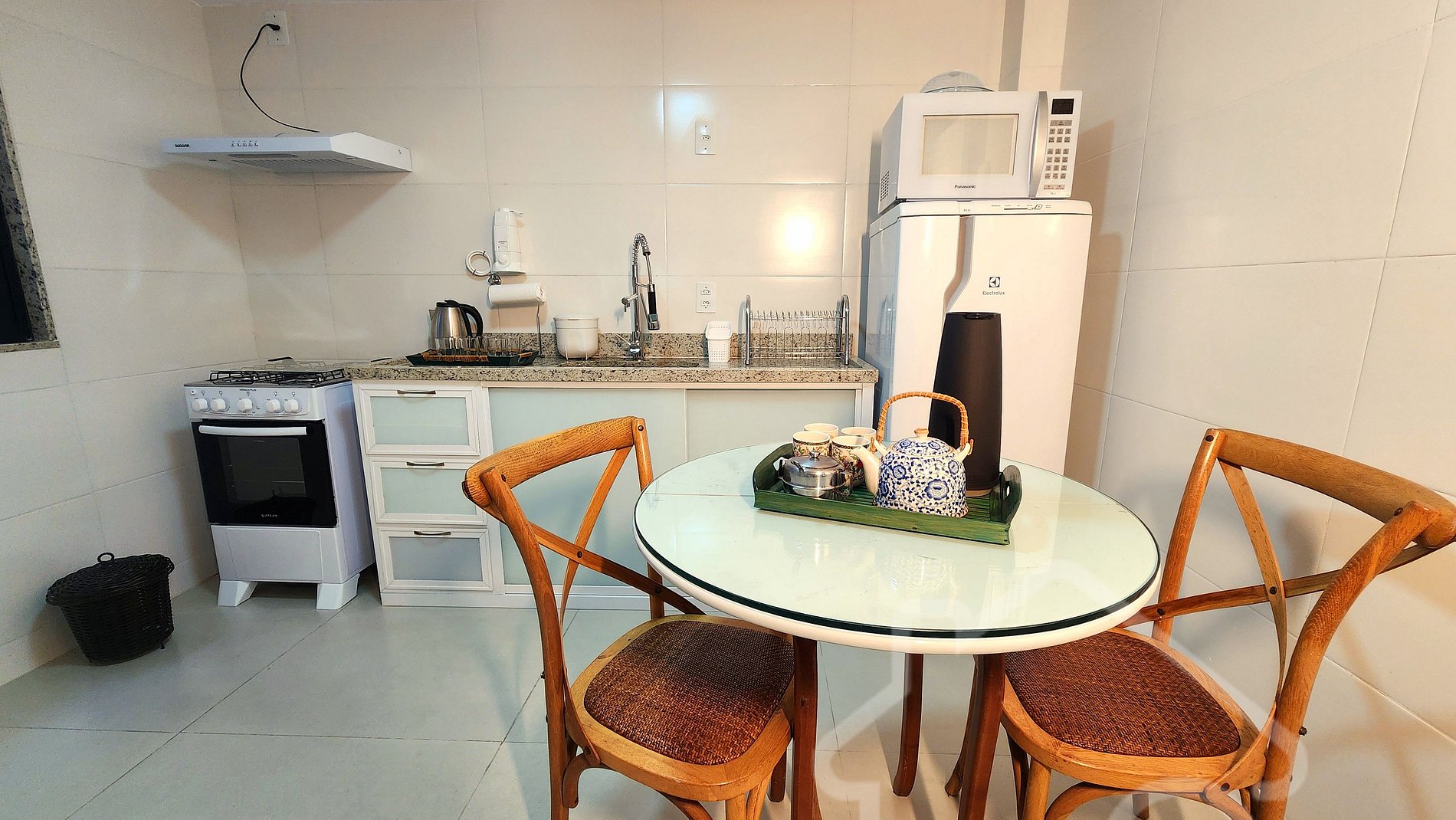 - Cozinha equipada: Fogão, geladeira, forno, micro-ondas, air fryer, chaleira elétrica, filtro de água e utensílios básicos.