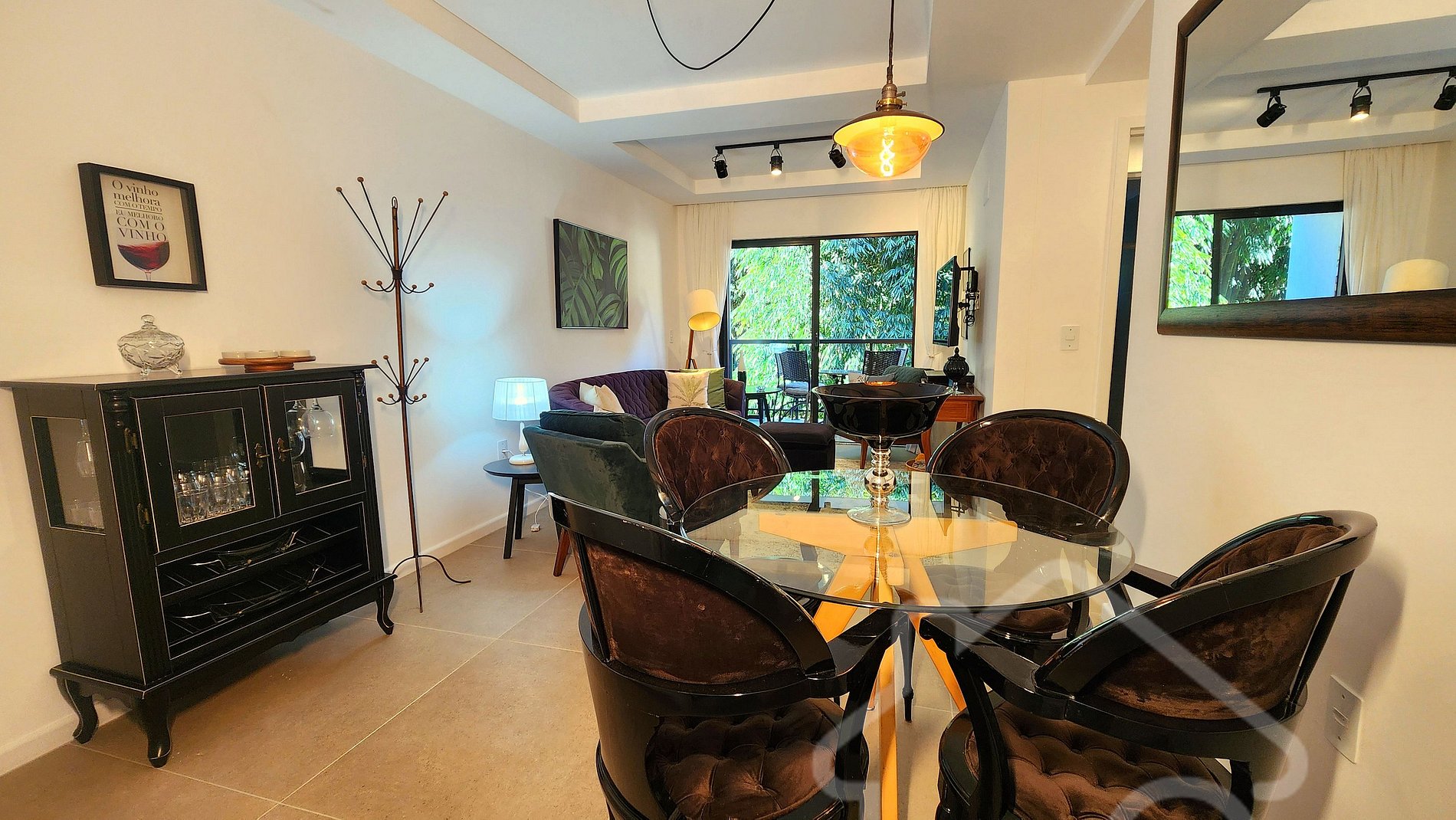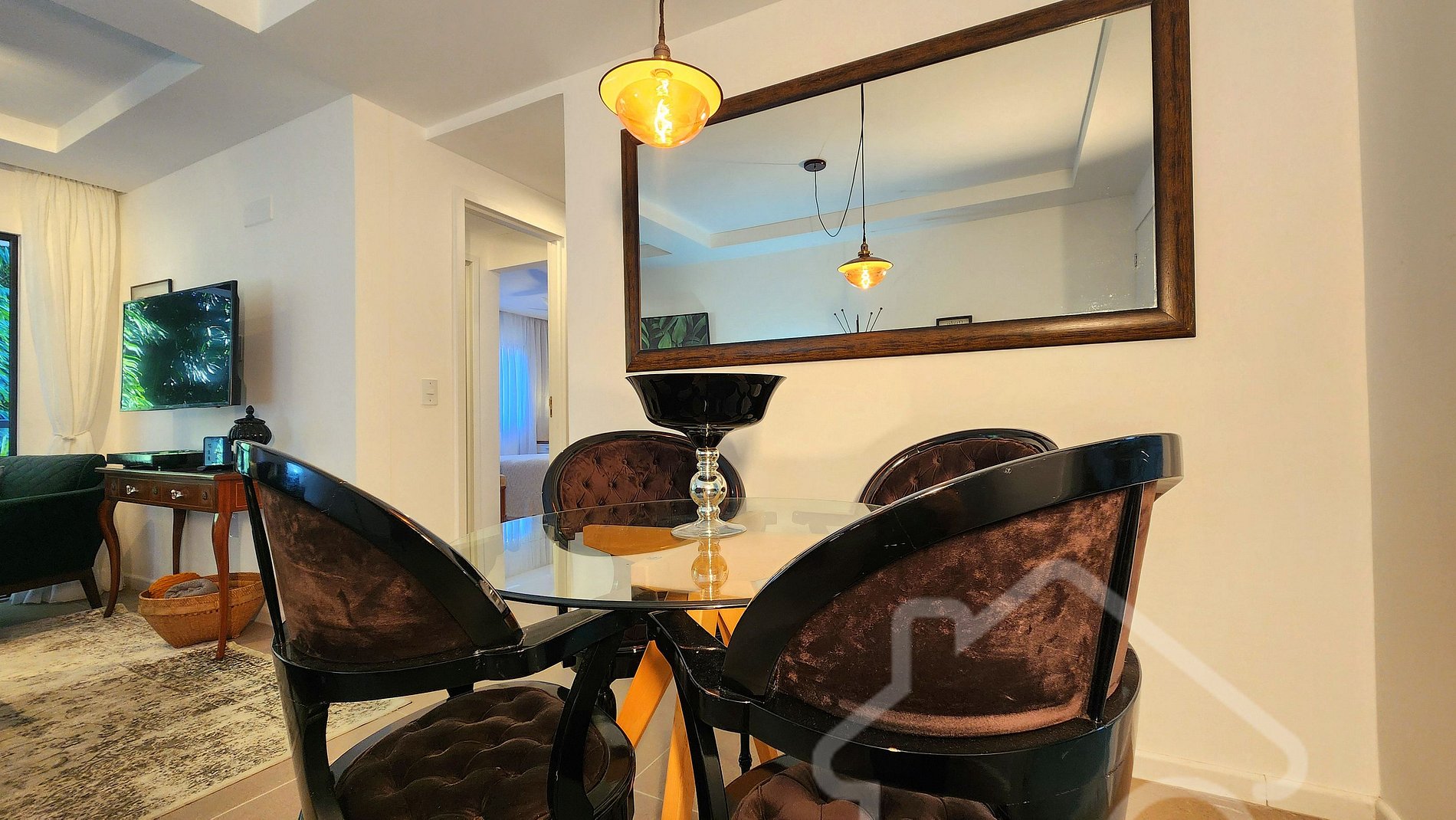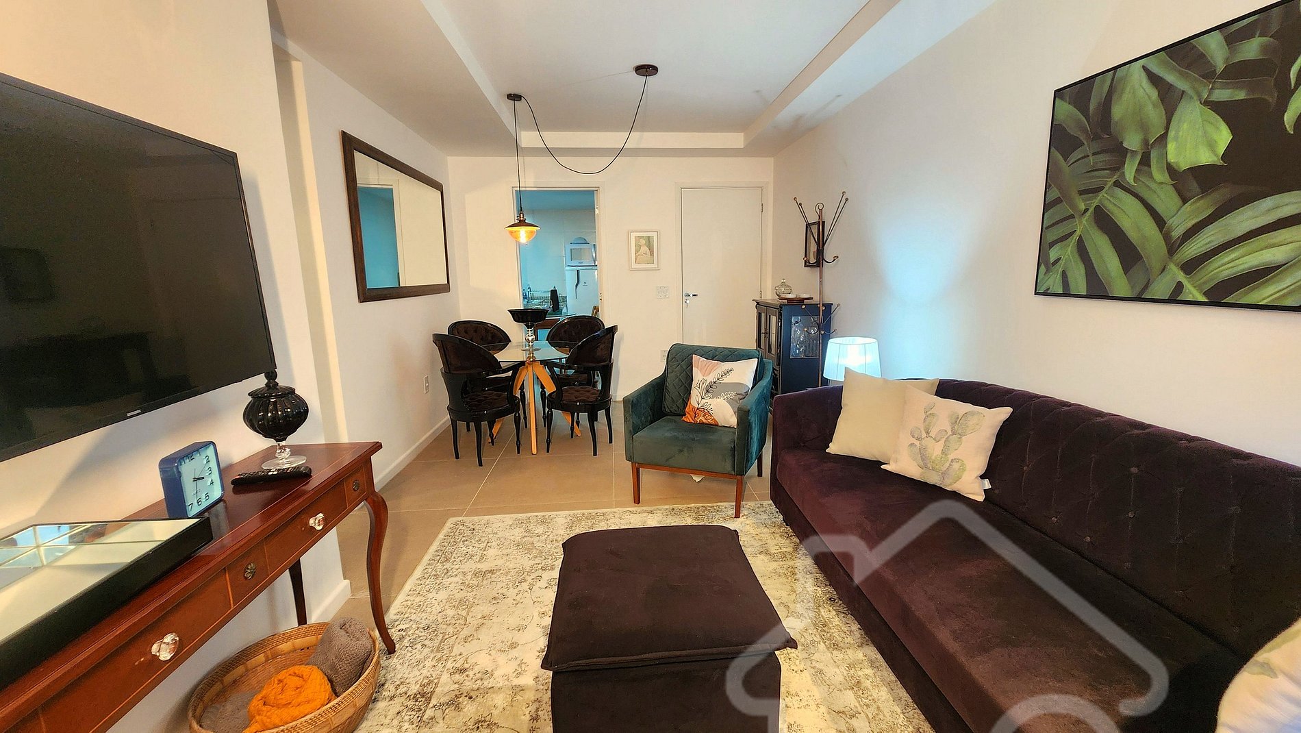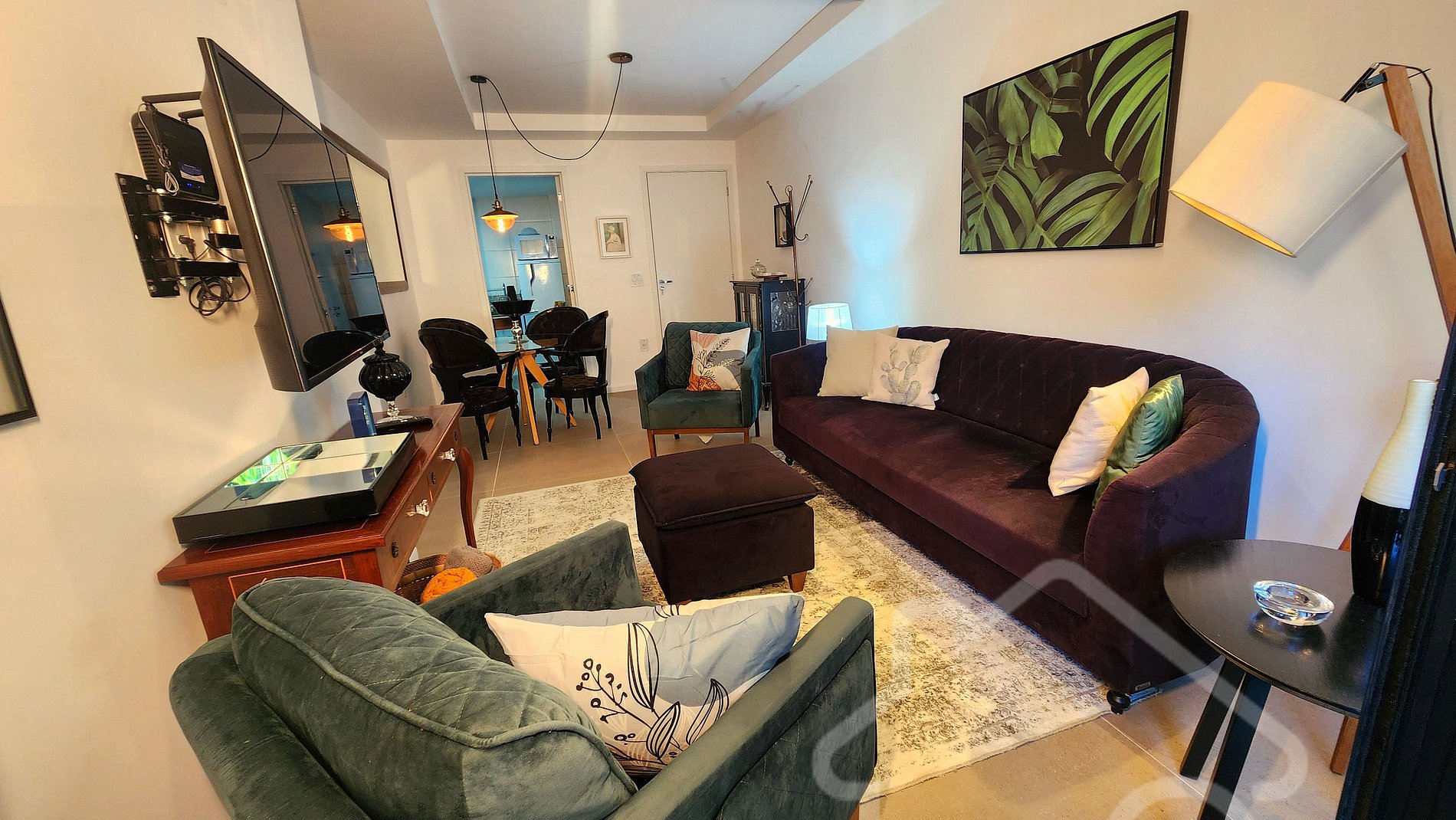 - Sala de estar integrada à sala de jantar: Smart TV, ambiente acolhedor, decorado e com acesso à varanda.
