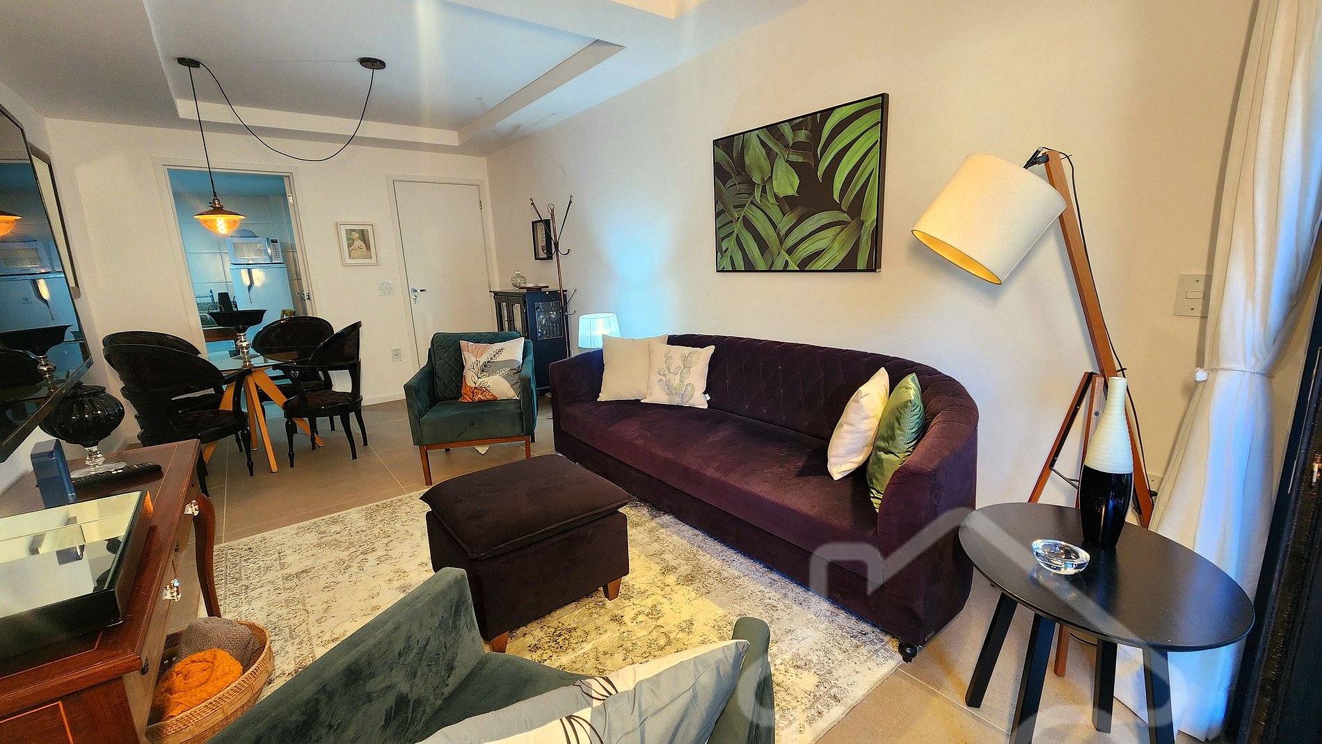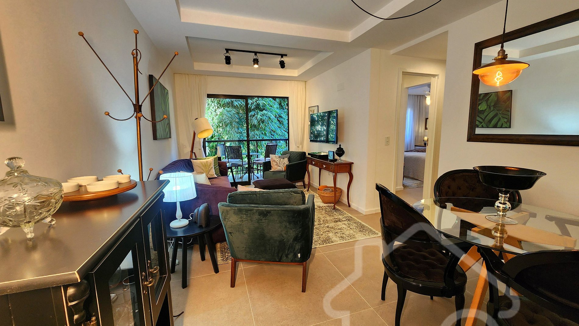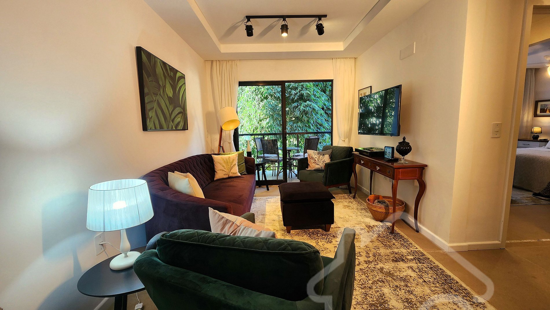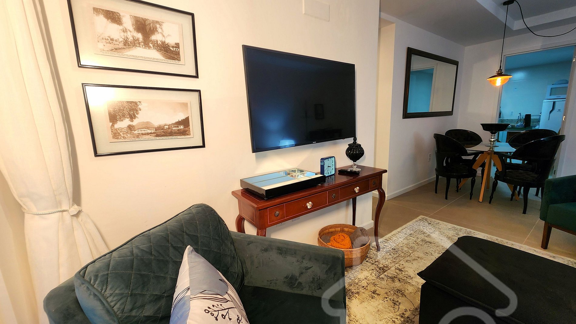 - Sala de estar integrada à sala de jantar: Smart TV, ambiente acolhedor, decorado e com acesso à varanda.