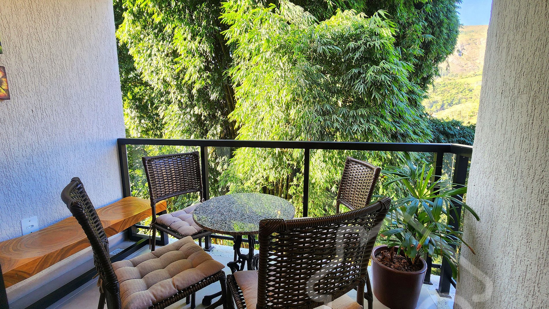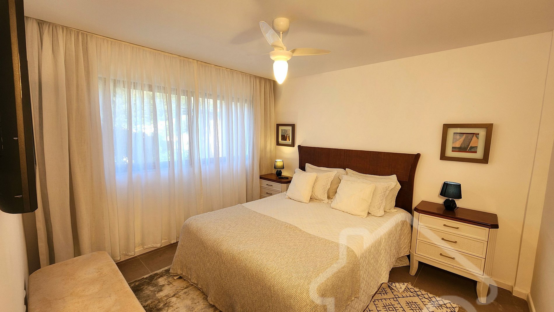 - Suíte: Cama queen, Smart TV com canais de streaming, arara, banheiro completo com chuveiro a gás e secador de cabelo.
