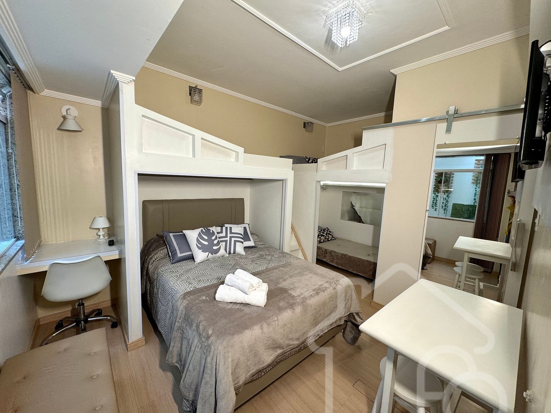 Estúdio reformado e super bem decorado no centro da cidade. Conta com 1 cama de casal, 1 mezanino com cama de casal e outro com cama de solteiro. Cozinha compacta equipada com geladeira, cooktop, sanduicheira e cafeteira elétrica. Banheiro social completo. Acomoda com conforto e praticidade, em localização privilegiada, próxima a comércios, restaurantes e pontos turísticos. Ideal para casais, famílias ou pequenos grupos.